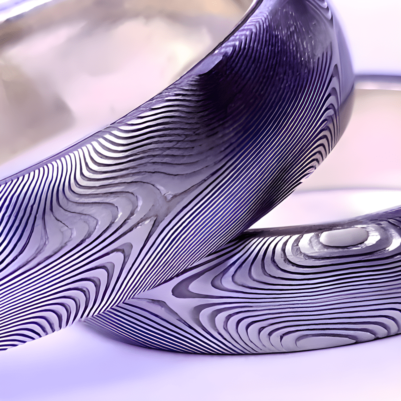 DAMAŠKOVÁ OCEL — spojení dvou druhů oceli do kompaktního celku, který po zpracování a proleptání vytváří unikátní vzory. Nejčastěji spojované materiály zahrnují zlato, stříbro a palladium. Rozmanité techniky zpracování a kombinace těchto materiálů přinášejí neopakovatelné šperky od Kotyzy.