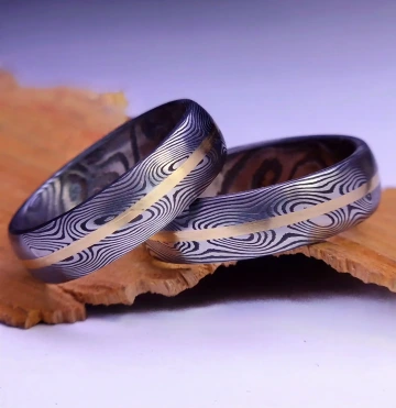MATERIÁL Kované snubní prsteny z vrstvené nerez oceli damasteel, pruhy z 18 karátového zlata (750/1000)