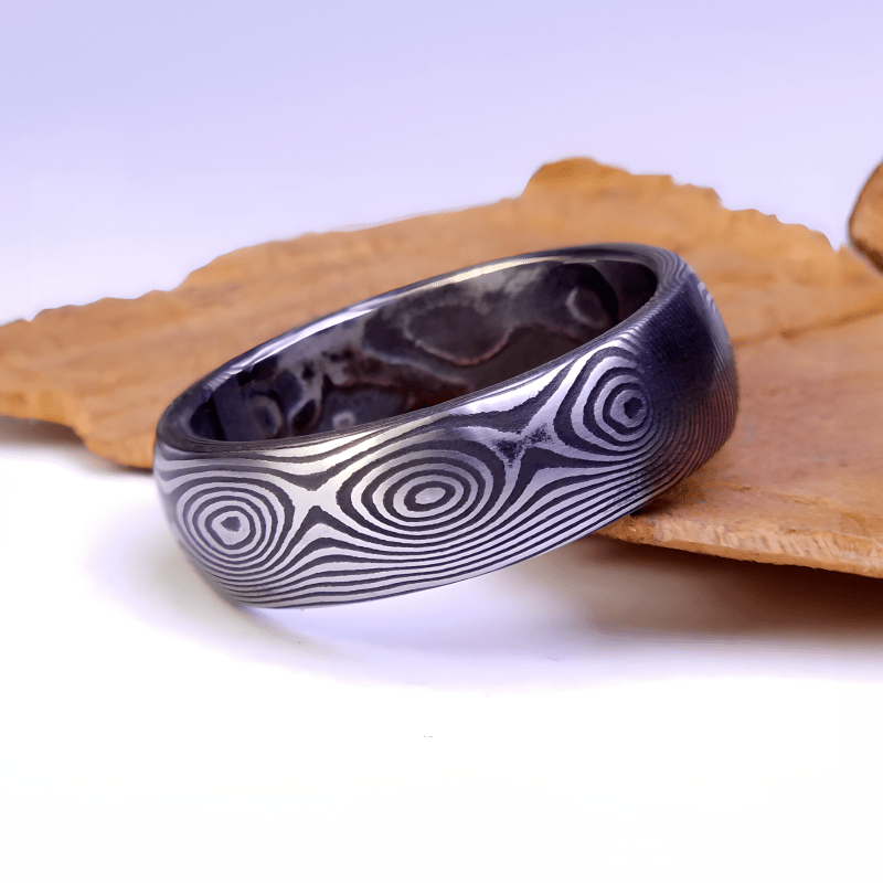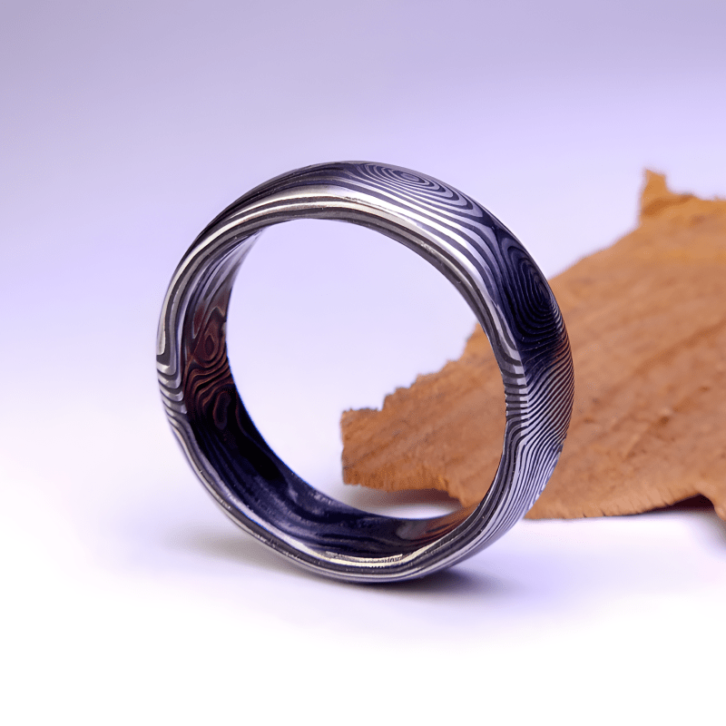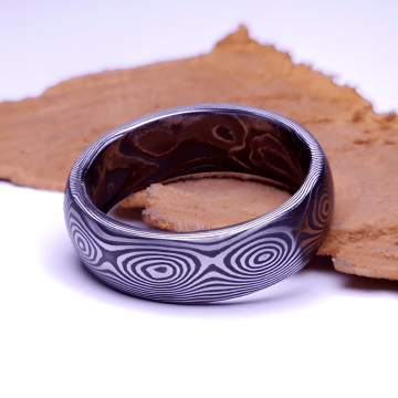 DAMAŠKOVÁ OCEL - obecně dva druhy oceli spojené v jeden kompaktní celek, který po zpracování a proleptání vytváří charakteristické vzory – vířivé linie, vlnovky, vrstevnice. Šperky lze různě kombinovat se zlatem, stříbrem nebo např. palladiem. Ondřej Kotyza uchopil tuto techniku a vtisknul do ní vlastní uměleckou expresi.