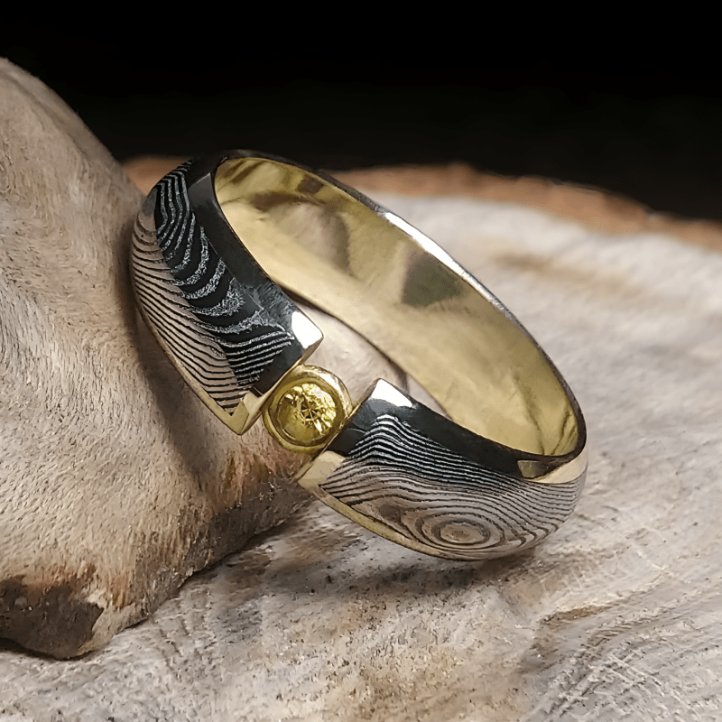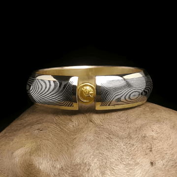 DAMAŠKOVÁ OCEL - obecně dva druhy oceli spojené v jeden kompaktní celek, který po zpracování a proleptání vytváří charakteristické vzory – vířivé linie, vlnovky, vrstevnice. Šperky lze různě kombinovat se zlatem, stříbrem nebo např. palladiem. Ondřej Kotyza uchopil tuto techniku a vtisknul do ní vlastní uměleckou expresi.